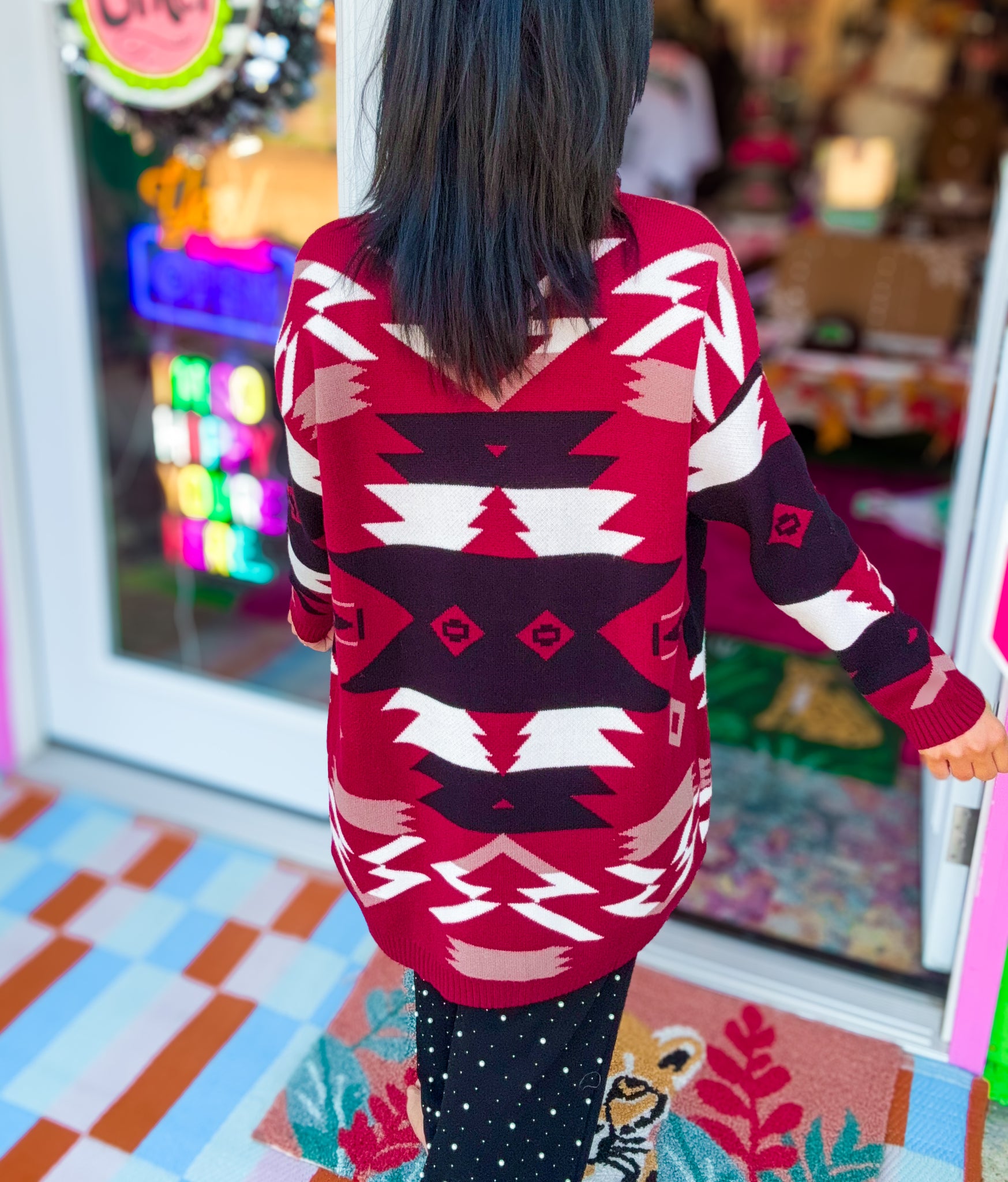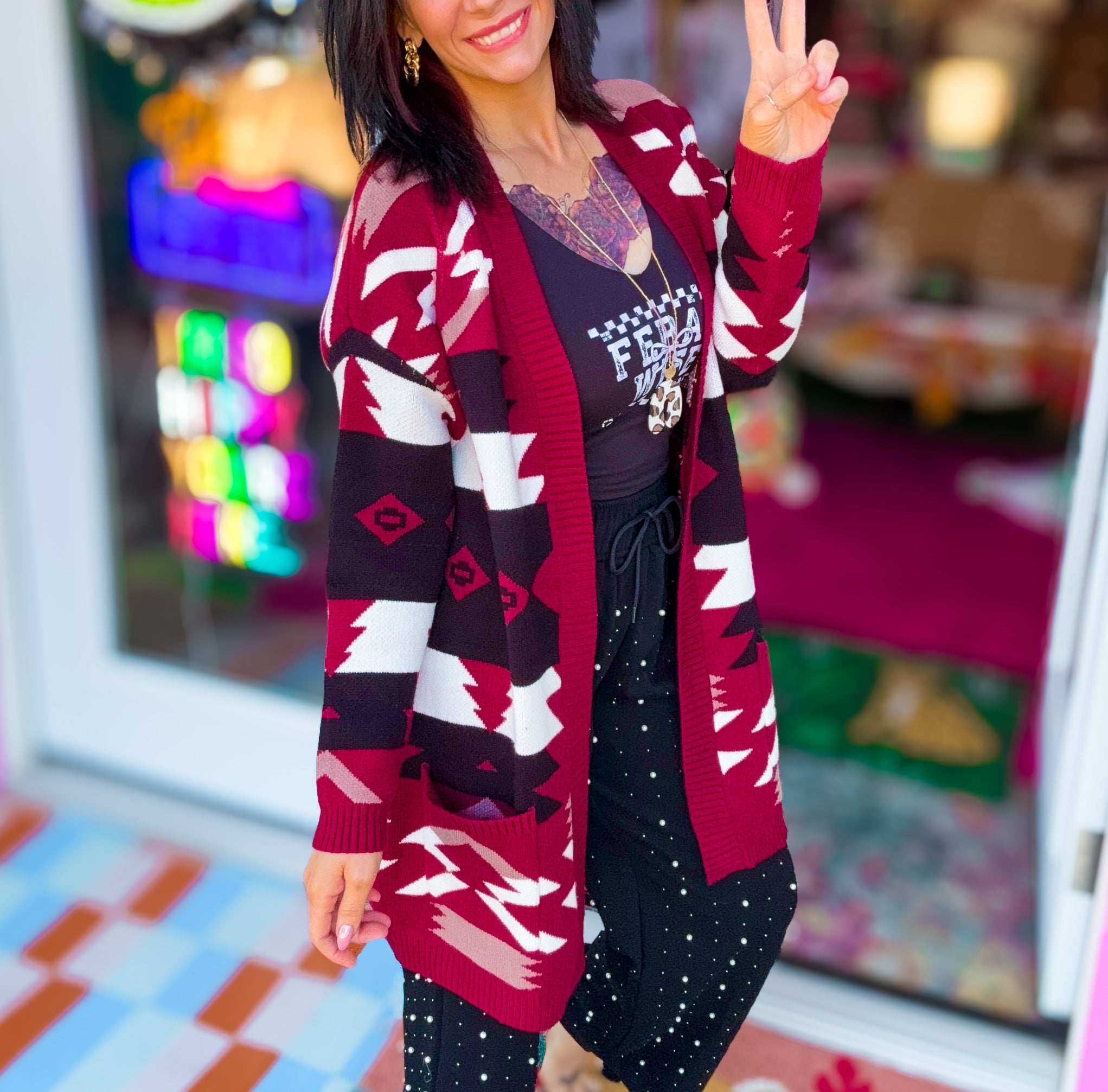 Meet your new statement layer—the Mustang Winds Cardigan. This cozy sweater cardigan features a rich maroon base with a bold Aztec-inspired pattern in warm fall tones that instantly elevate any outfit. The soft, medium-weight knit keeps you warm on crisp morning coffee runs and cozy bonfire nights, while the relaxed fit makes it perfect for easy layering. Style it with jeans and boots for an everyday look, or dress it up over a little black dress for a touch of effortless glam. A must-have fall staple you’ll love reaching for again and again. Rhaelyn is wearing the S/M. 🍂✨