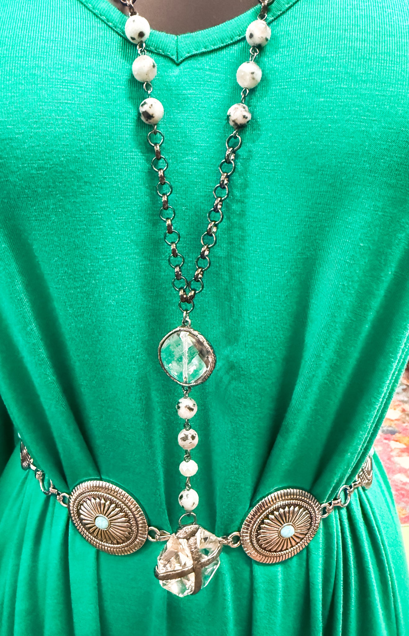 Elevate your look with the enchanting Moonstone Muse Necklace. Featuring delicate speckled beads and a stunning crystal pendant, this piece blends boho charm with feminine elegance.