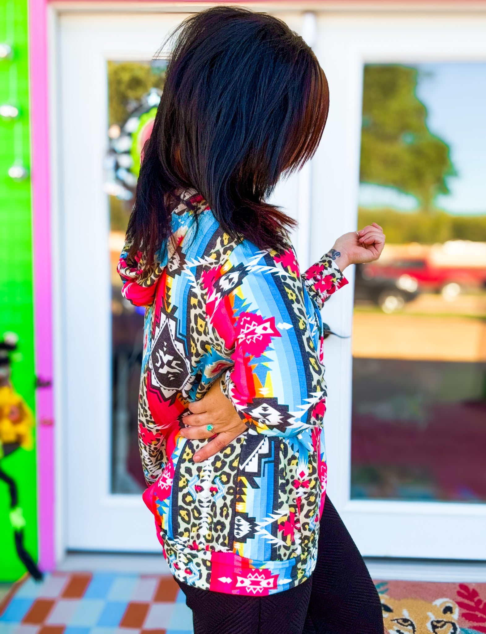 Turn heads wherever you go in the Navajo Nights Hoodie! 🌈💖 This relaxed-fit hoodie is your go-to for rodeos, festival nights, or cozy everyday adventures. Bursting with bright, bold multi-prints and featuring the super popular kangaroo pocket to hold all your essentials, it’s equal parts fun, functional, and western-chic.